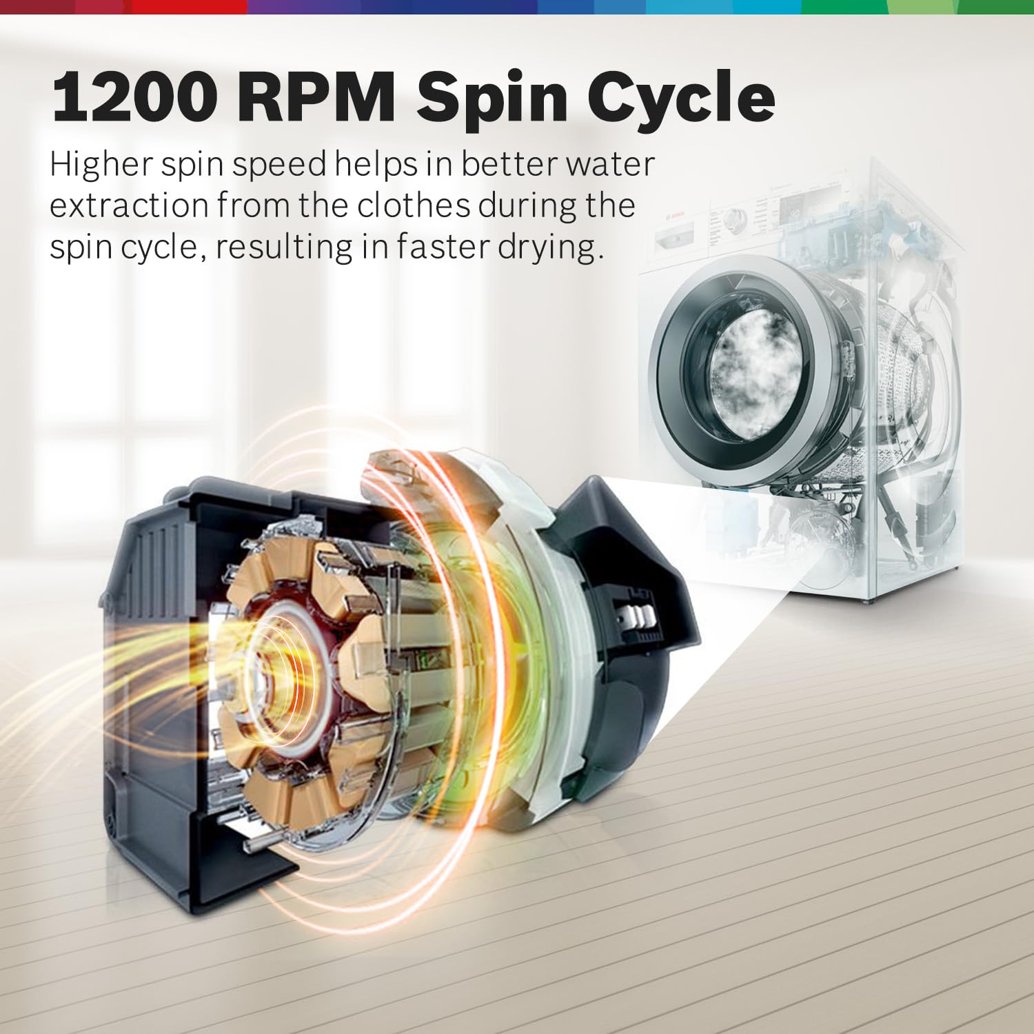 - 1200 RPM : Higher spin speed helps in better water extraction from the clothes during the spin cycle, resulting in faster drying; copper winding for long-lasting