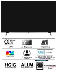 - Smart TV Features: WebOS Smart TV | AI ThinQ | Apple Airplay 2 & Homekit | Game Optimizer| Filmmaker Mode | α5 AI Processor 4K Gen6 | HDR 10 |1.5 GB RAM + 8 GB Storage | Unlimited OTT App Support: Netflix, Prime Video, Disney+ Hotstar, Apple TV, Jio Cinema, SonyLIV, Discovery+, Zee5, Voot, MxPlayer, Google Play Movies & TV, YuppTV, Youtube
