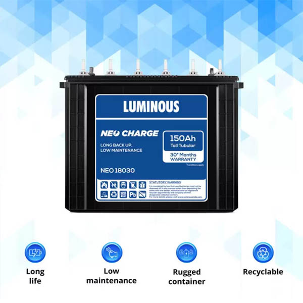 Battery 150 Ah – NEO 18030 The economical range of tubular inverter batteries with high performance, made using rugged tubular plates. These batteries require minimum maintenance and withstand long and frequent power cuts. Super charged performance Tubular Plate design, Suitable for frequent power cut areas High back-up performance Excellent overcharge resistance Minimum Maintenance.